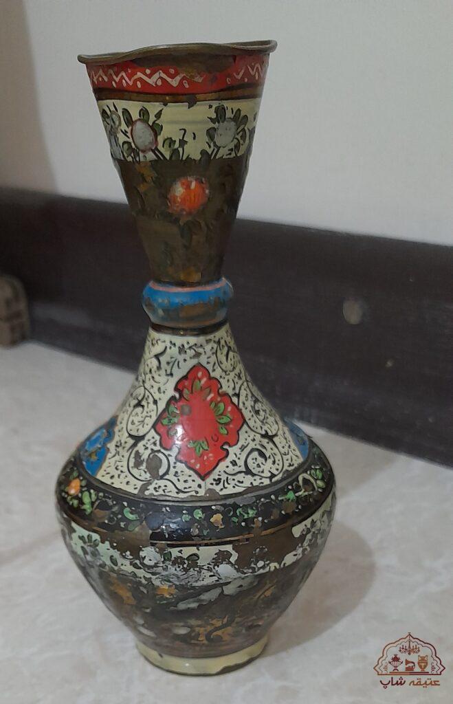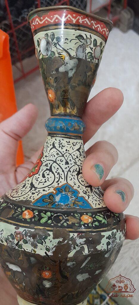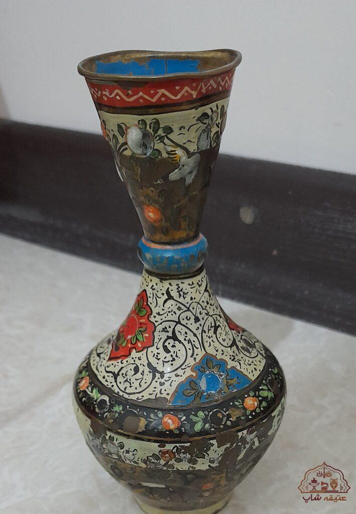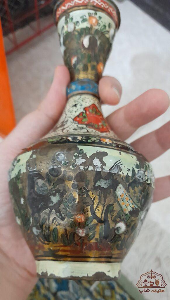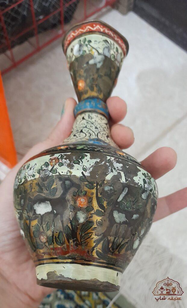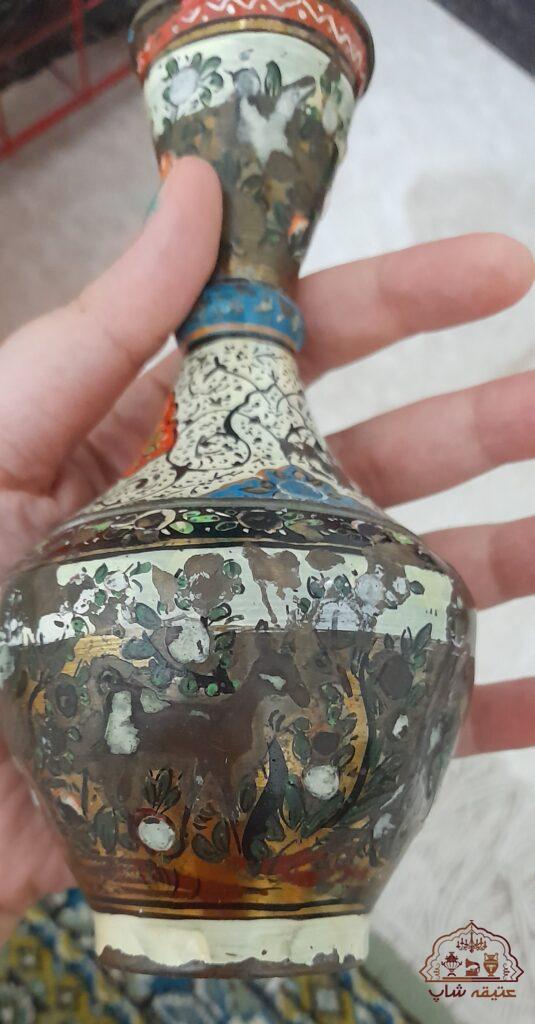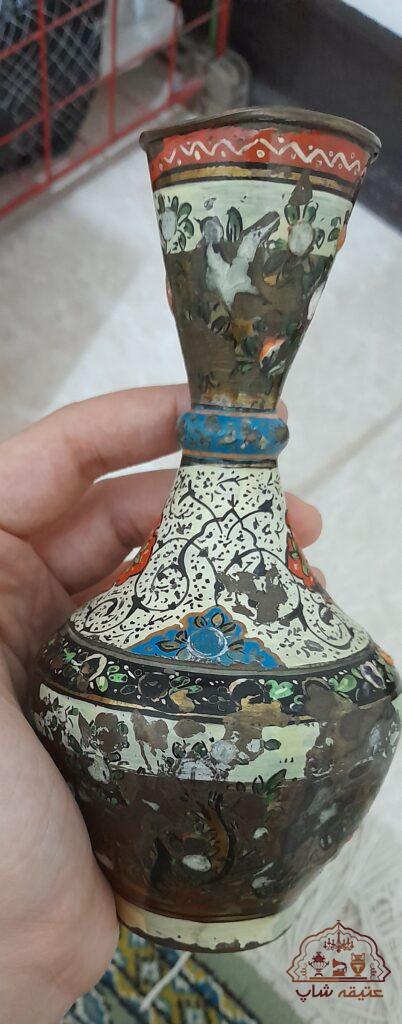 گلدان قدیمی از جنس برنج قدمت دوره قاجار ۱۰۰تا۲۰۰ سال..میناکاری شده ولی بعضی نقاطش پاک شده و نیاز به مرمت داره